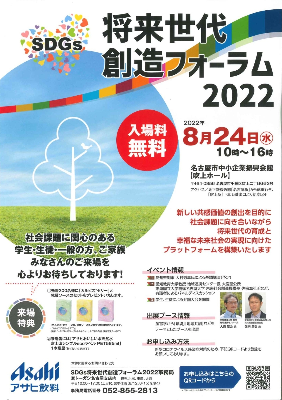 2022年8月24日(水)、名古屋市中小企業振興会館【吹上ホール】にて『SDGs将来世代創造フォーラム2022』が開催されます。