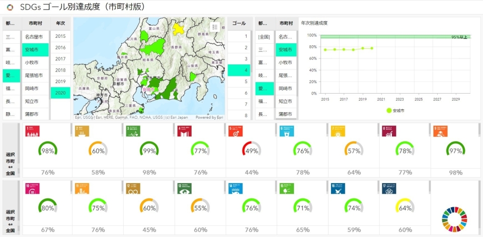 こちらのサイトですが、「中部圏SDGs広域プラットフォーム」のホームページで公開されておりまして、「Project」から「ゴール別達成度(市町村版)」へ進むと、自治体のSDGsの進捗度を確認することができます。
