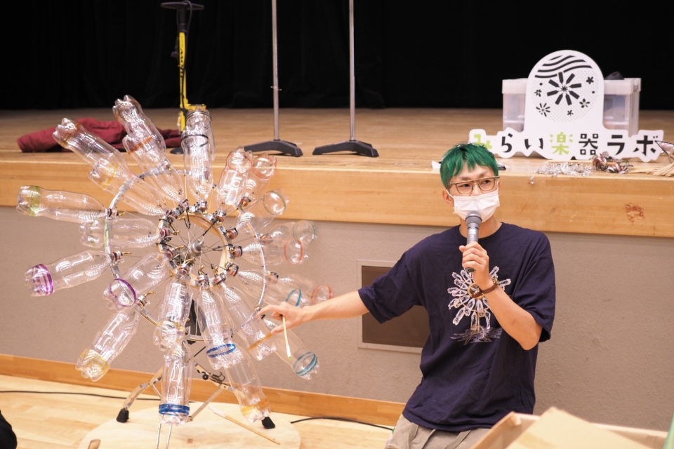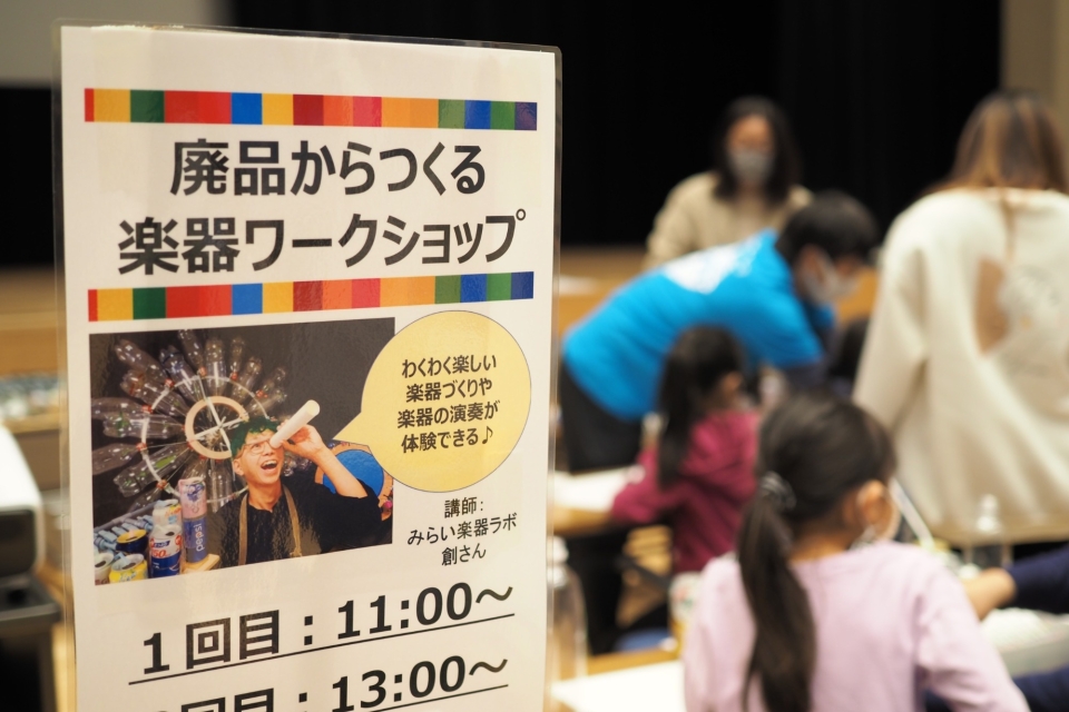 イベントの目玉のひとつとして廃品楽器アーティスト!?でもある『みらい楽器ラボ』の創さんをお招きして、廃品で作る楽器ワークショップも開催しました。