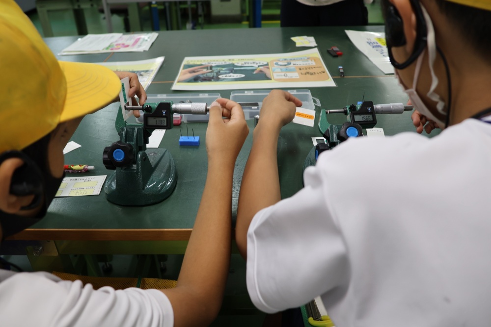 オティックスでは従来 推進してきた小中学生向けの工場見学会に、更なる地域貢献の強化のため、2023年に「OTICSラボ」を新設。オティックスの強みである精密加工や品質保証を体験いただくコーナーである。既に鶴城小学校、平坂中学校、中畑小学校、西尾市中学生リーダー養成塾の産業チームに見学と体験をしていただいた。工場見学で子ども達は、産業ロボットの見学とともに重量物を軽々と持ち上げられる「吊り具」を体験。OTICSラボで若手スタッフと一緒に1/1000㎜まで測定できる電子マイクロメーターで製品の寸法の測定し、そして「3/1000㎜の違いにより何が起きるか?」実際の部品を使って体験していただいている。