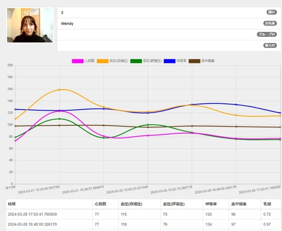 約8秒の顔の映像データから血管の変化を捉え、呼吸、心拍、血圧、血中酸素などの生理パロメータをAI解析します。本サービスは、健康経営企業・官庁・工場・運送業・介護・建設現場など、さまざまな分野で利用されることを予想しています。