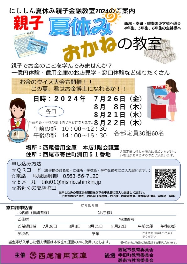 当金庫では西尾市、碧南市、幸田町の小学4~6年生を対象に、お金の大切さを知り、日常の生活においてお金の有意義な使い方ができるように親子で楽しく参加できる「夏休み親子金融教室」を開催します。